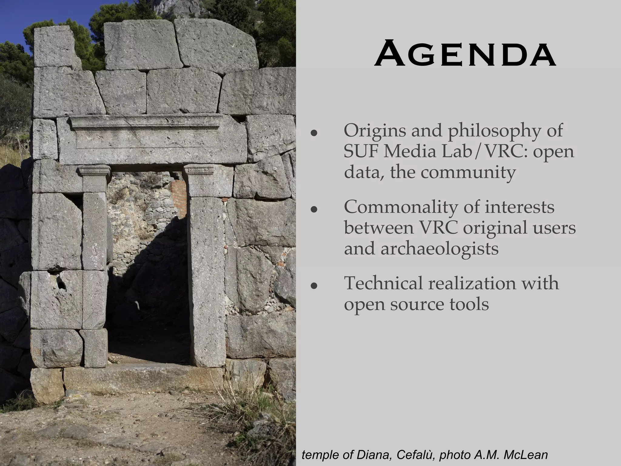 The document discusses the origins and goals of the VRC Project, which aims to develop an open cataloguing standard for open data. It began at Syracuse University Florence's Media Lab with efforts to digitize and share slide collections across disciplines. Archaeologists also have interest in flexible classification tools. The VRC uses open source tools like Java, RDF, and SPARQL to create a cataloging system with entities, relationships, and temporal data. It seeks to establish an open data community through sharing vetted resources from sites in Italy and beyond.