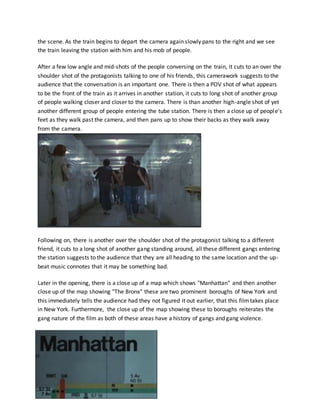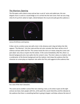 The opening scene shows a Ferris wheel at night with eerie music playing. The title "The Warriors" appears in red letters as a train passes by, connoting violence. Various gangs are shown arriving by train to the same location in New York. Through shots like close-ups and over-the-shoulder shots, the film establishes important characters and conversations while showing the different gangs converging. It ends with the gangs gathering in an argument before cutting to black.