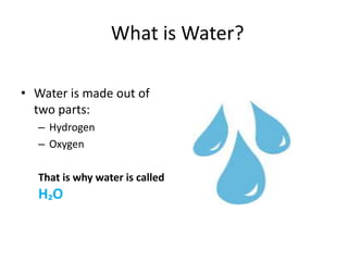 The document discusses the water cycle and its importance. It explains that water exists as solid, liquid, and gas and provides examples. It notes that water is recycled through evaporation from bodies of water, condensation in clouds, precipitation as rain or snow, and accumulation back in bodies of water. The constant movement of water through this cycle is known as the water cycle. It discusses how floods can occur if too much rain falls and droughts if not enough rain falls.