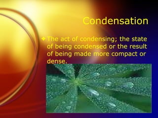 The document defines key terms related to the water cycle, including condensation, evaporation, precipitation, snow, rain, hail, surface runoff, transpiration, and accumulation. It explains that condensation is the act of condensing or becoming more compact, while evaporation is matter passing off as vapor. Precipitation, snow, rain, and hail describe various forms of condensed water falling from the atmosphere. Surface runoff and transpiration are parts of the water cycle involving water flow over land and through plants. Accumulation also refers to investing terms.
