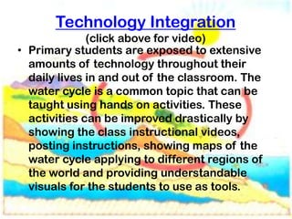 This document discusses how technology can be used to teach students about the water cycle. It provides examples of instructional videos, interactive websites, games and diagrams that explain the water cycle. It also lists several reputable websites from government agencies and science organizations that contain educational resources about the water cycle, its processes, and importance. The goal is to enhance student understanding of the water cycle through multi-media presentations and hands-on digital activities.