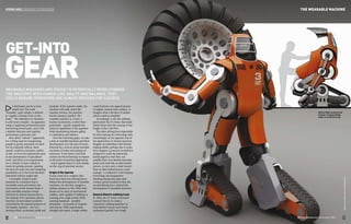 Wearable machines have the potential to revolutionize industries by providing human-like agility and balance to operators. The document discusses the history of wearable machines from early military exoskeletons in the 1950s designed to give soldiers superhuman strength to current developments that allow direct control of machines through brain interfaces. A concept for a wearable machine called Mecha-MAX is presented, which is a powered exoskeleton suit that can lift over 3,000 pounds and mimic human movements, with the goal of amplifying a person's physical capabilities.