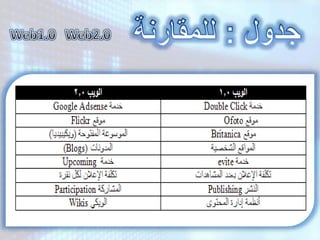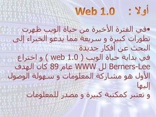 تتناول الوثيقة تطور حياة الويب منذ بداياته عام 1989 مع اختراع www، وأهمية تقنيات مثل ajax وrss، وتنظيم المحتوى عبر المدونات ووسائل التواصل. كما تسلط الضوء على مستقبل الويب 3.0 أو ما يُعرف بالويب الدلالي، الذي يعد ثورة في معالجة المعلومات من خلال السماح ببحث أكثر فاعلية وتوجيه المعلومات للاستخدام البشري. مقارنات بين الويب 1.0 و2.0 و3.0 توضح هذه التطورات.