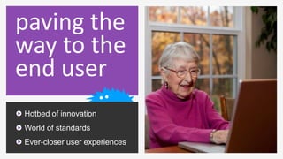 The document discusses the evolution of web browsers, focusing on advancements in HTML5 and CSS3 technologies that enhance user experiences. It highlights the importance of standards-based browsing, the role of Internet Explorer in this evolution, and the benefits of technologies like IndexedDB and WebSockets for offline application performance. The document also emphasizes the need for innovation in the web space to deliver compelling end-user experiences.