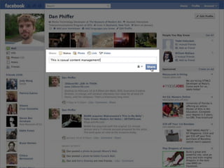 The document discusses the topics that will be covered in a six-session course on casual content management and WordPress development. The sessions will include an overview of PHP, four weeks focused on WordPress development, and a final project presentation week. Students will start with warm-up PHP exercises and build up to creating a WordPress child theme and WordPress theme from scratch.