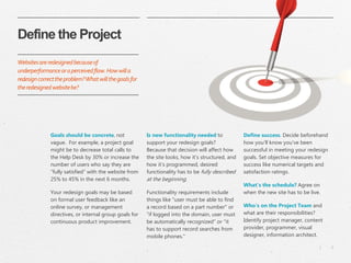 This document outlines the key steps in a successful website redesign process: