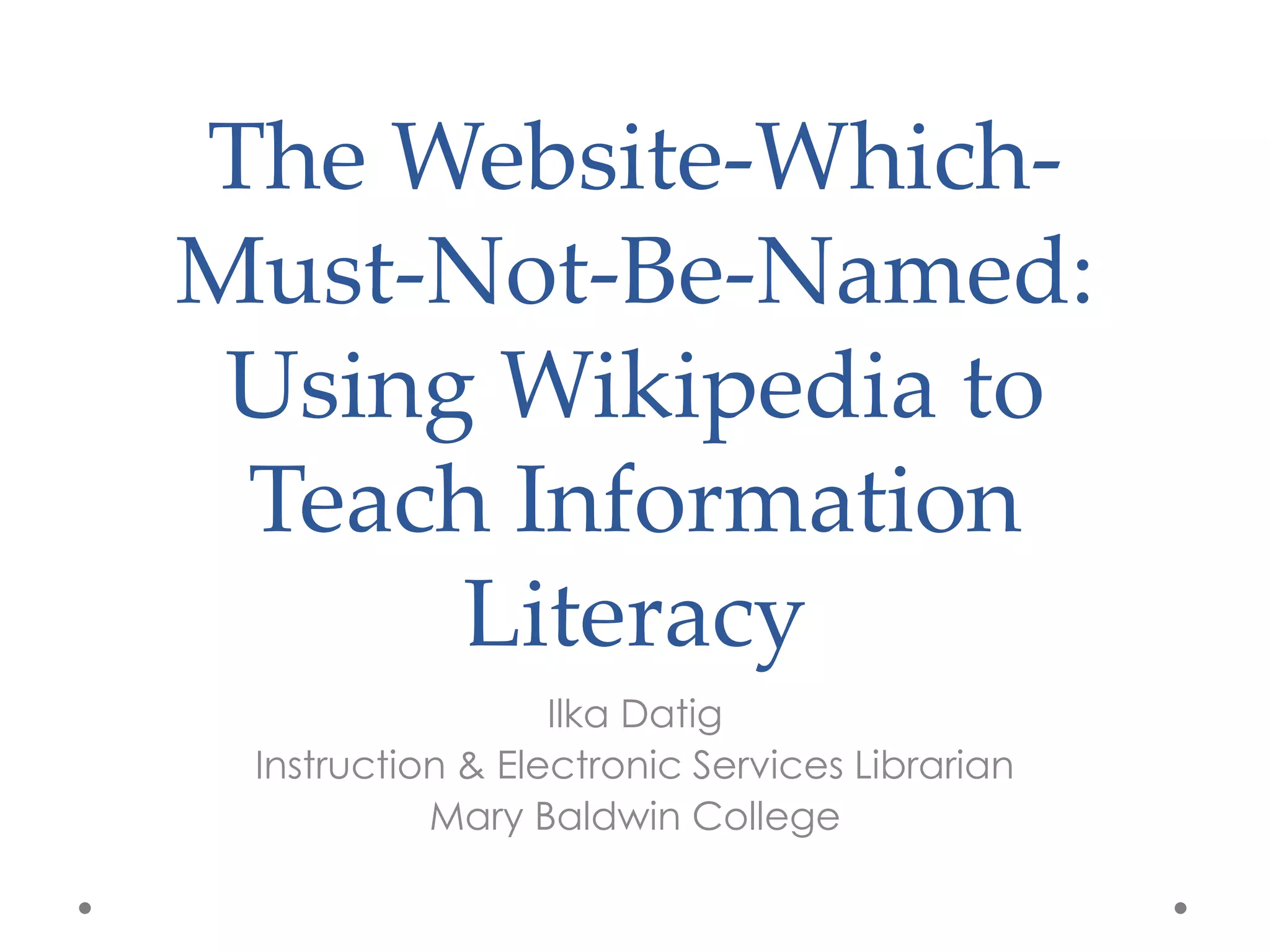 This document discusses using Wikipedia to teach information literacy skills in college classrooms. It begins by outlining why Wikipedia should be used, noting its popularity and ubiquity. Several classroom activities are described that use Wikipedia, such as evaluating the credibility of Wikipedia entries, identifying and following citations, and editing Wikipedia entries. The document concludes by listing additional resources for using Wikipedia in information literacy instruction and posing the question of whether Wikipedia represents "Wikiality".