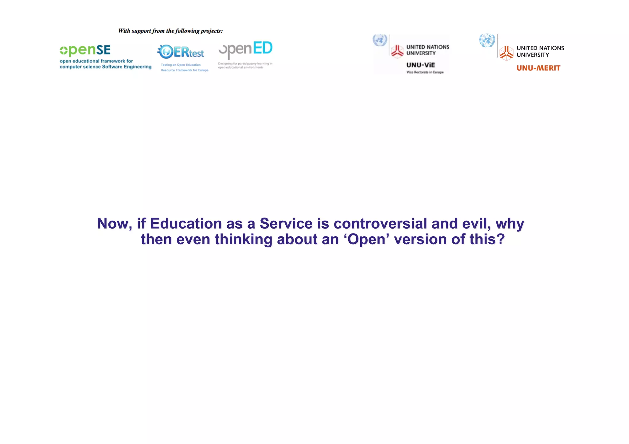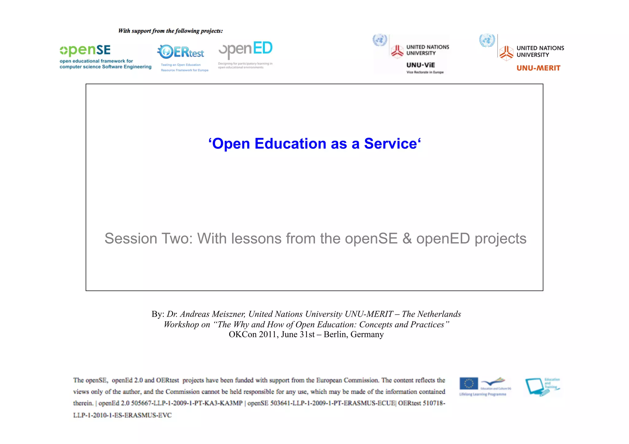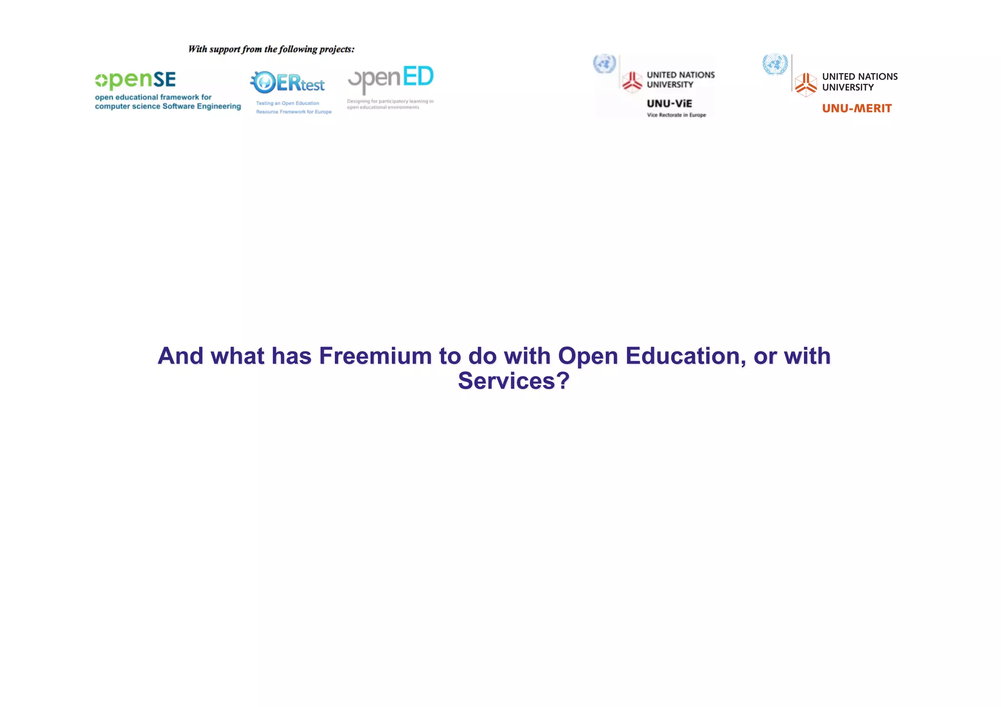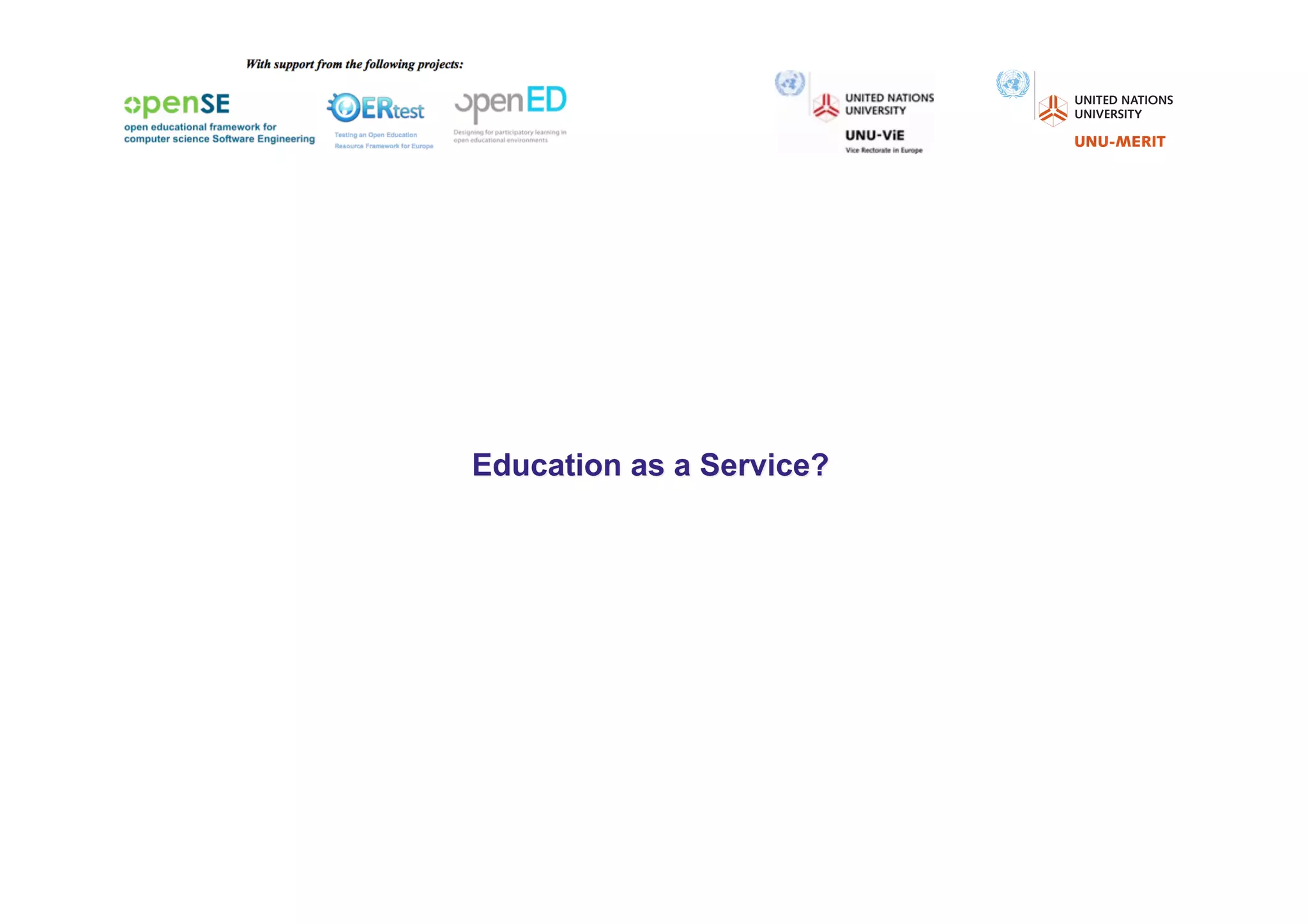 The document discusses 'Open Education as a Service' (OEaaS), highlighting the implications of the General Agreement on Trade in Services (GATS) on education, which faces opposition due to concerns over privatization and commercialization. It advocates for a transparent education model that can unbundle costs and allow for sustainable modernization of educational services, including freemium business models for additional paid services. The author, Dr. Andreas Meiszner, emphasizes the necessity for clear cost structures in education to address the financial aspects of open education.