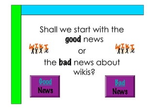 This document discusses the benefits and features of wikis, highlighting their ease of use, collaborative capabilities, and accessibility for both educators and students. It outlines different types of wikis (public, protected, private) and provides safety tips for usage in educational settings. Additionally, it offers resources for creating and utilizing wikis effectively in the classroom.