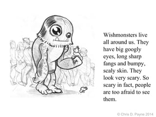 Wishmonsters are playful and generous creatures with scary appearances that often leave them lonely and overlooked. They exist to grant wishes, which they collect and transform into what people truly desire. However, nowadays, fewer wishmonsters exist, making it essential for wishes to be big and bright to attract their attention.
