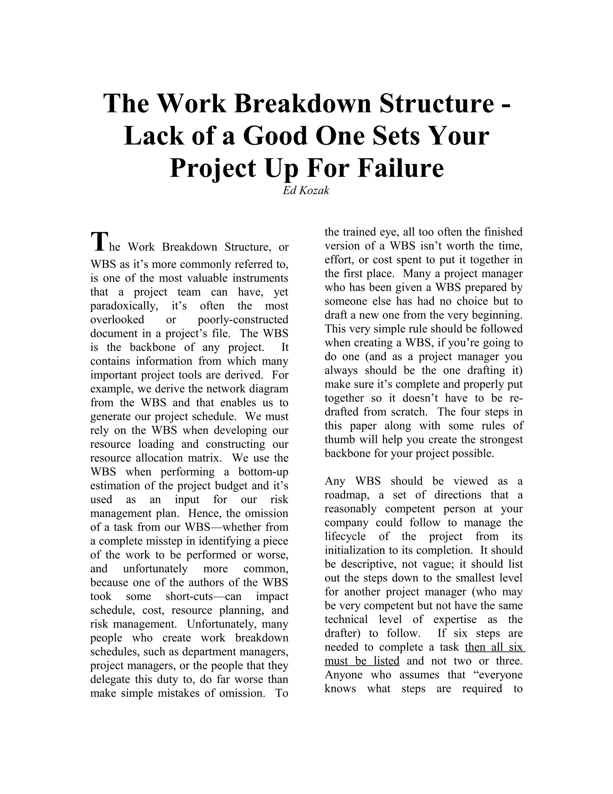 The document emphasizes the critical importance of a well-constructed Work Breakdown Structure (WBS) for project success, stating that a poorly prepared WBS can lead to project failures. It outlines four essential steps for creating an effective WBS, including listing deliverables, breaking down tasks, and ensuring logical task flow, all of which serve as a roadmap to manage project lifecycle. The author, Ed Kozak, underscores the role of the WBS in financial monitoring, resource allocation, and risk management, advocating for its mandatory use in all projects.