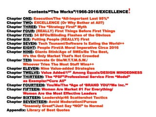This document is a summary of Tom Peters' reflections over 50 years from 1966 to 2016. It is presented in PowerPoint format but contains over 50,000 words of annotation. The document outlines 17 chapters on topics like execution, excellence, innovation, technology trends, and leadership. Peters encourages the reader to try new ideas and tactics, learn from social media, and take action to drive organizational performance and excellence.