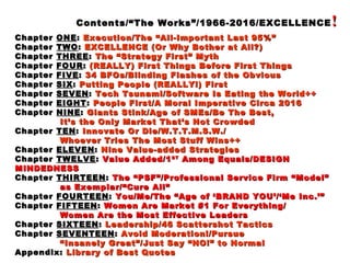 This document is a 17-chapter book in PowerPoint format summarizing Tom Peters' reflections over 50 years working in business and management from 1966 to 2016. Some of the key topics covered include the importance of execution, pursuing excellence in all activities, prioritizing people, embracing technological change, innovating continuously, recognizing the growing power of women as consumers and leaders, and the importance of small- and medium-sized enterprises in today's business world. The document encourages readers to try new ideas and approaches and avoid moderation in the pursuit of outstanding results.