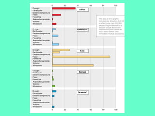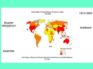 The document discusses natural hazards and disasters. It defines hazards as natural events that involve people, where social and environmental factors can turn an event into a disaster. There are two main classifications of hazards: hydro-meteorological hazards caused by weather patterns like floods and storms, and geophysical hazards caused by earth processes like earthquakes, volcanoes, and landslides. A disaster is defined as a natural event that causes human or economic losses. While the number of deaths from disasters has decreased due to better preparedness, the number of people affected and economic costs have risen due to increasing population in vulnerable areas and climate change impacts.