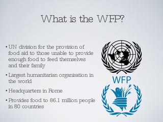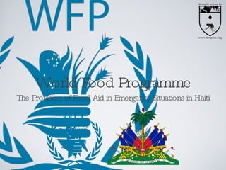 The World Food Programme (WFP) is the largest humanitarian organization that provides food aid to over 86 million people in emergencies worldwide, including in Haiti, where a significant portion of the population lives below the poverty line. The WFP responds to crises caused by factors like political turmoil and natural disasters, initiating emergency operations and logistical support to deliver aid effectively. Despite complications from gang violence, infrastructure challenges, and prior food crises, the WFP managed to feed 700,000 people in Haiti by the end of 2008 and continues to focus on long-term food security initiatives.