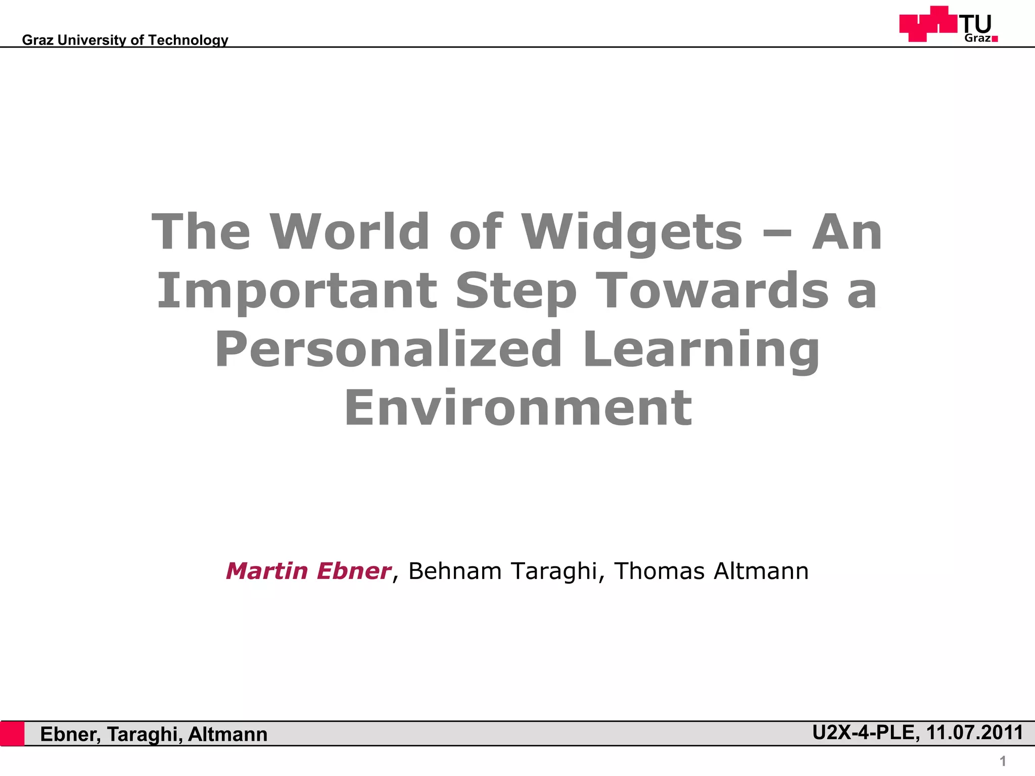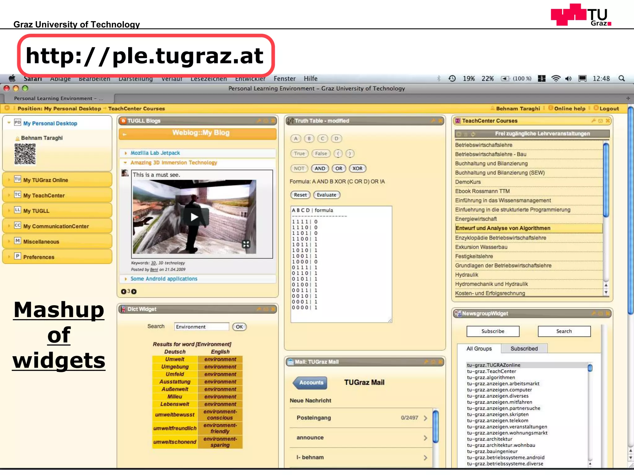 This document discusses the development of a personalized learning environment (PLE) at Graz University of Technology. Usability tests were conducted with technical and non-technical users, finding that the PLE concept was unfamiliar and introductions were needed. Tracking usage data showed the most used and activated widgets, which could be improved using a K-selection strategy. The PLE aims to provide personalization, mobile access, and allow combining widgets to create new functionalities, representing an evolution guided by principles of variation, selection, and recombination.