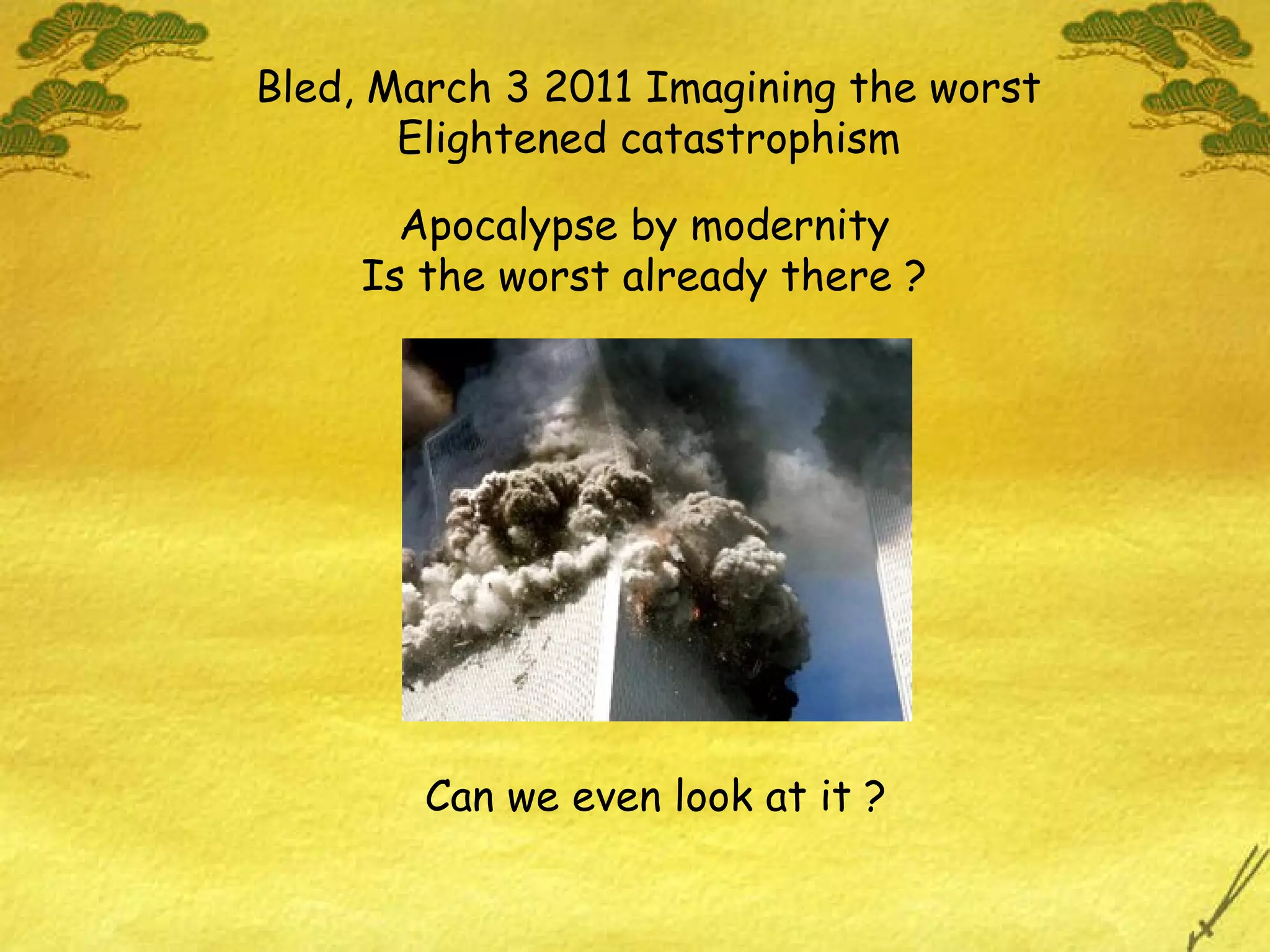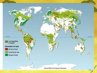 The document discusses several topics related to global challenges facing humanity, including population growth, resource scarcity, environmental degradation, and the impact of technology. It notes world population is expected to peak and then decline this century, but also highlights issues like shrinking cities, planetary limits, and the vulnerability of ecosystems. The document questions whether modern technology can be guided towards more sustainable models or if existing crises will continue worsening due to factors like climate change, pollution, and economic instability. It presents some visions for moving from the current challenges to a more stable and sustainable future through approaches like education, public works, and off-planet habitation.