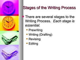The document discusses the stages of the writing process, including prewriting, writing (drafting), revising, and editing. It provides details on each stage, such as choosing a topic and determining the audience, purpose, tone, and point of view in prewriting. When writing a draft, writers should create a title and compose body paragraphs with a topic sentence and support for each point. The revision stage involves finding and correcting issues with content, and making ideas clearer and stronger.