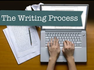 The document outlines the typical steps in the writing process: prewrite, draft, revise, edit, and publish. It provides details about common activities for each step. In the prewrite step, writers plan by considering their purpose, audience, topic, and how to structure their writing. For the draft, writers create their initial version. In the revise step, writers re-read and make changes. The edit step involves fixing grammar, spelling, and formatting errors. Finally, in the publish step, writers decide their work is complete. The document also includes an example of guiding students through a shortened writing process to practice the different stages.