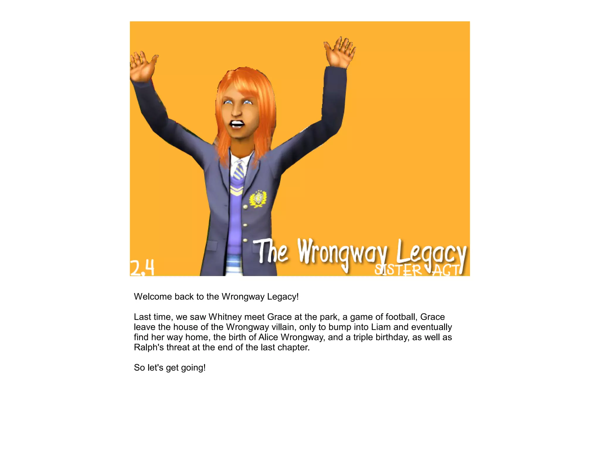 The document provides an overview of events in the Wrongway Legacy series. It summarizes Alice's birthday party, Grace becoming worried that her younger sister Alice will replace her, Grace reassuring Elizabeth, the family adopting a dog named Edward, Grace turning into a teenager and having her own birthday party in the woods planned by Whitney, Grace feeling alone at the party until meeting Penelope and Carl, and Grace talking with Orlando and deciding they can be friends. It concludes with the Wrongway family traveling to Twikki Island for a holiday.