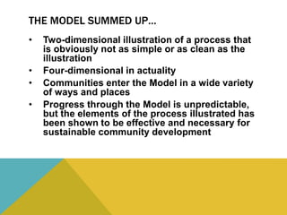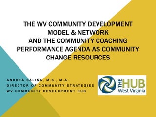 This document summarizes the West Virginia Community Development Hub and its resources for community change, including the Community Development Model and Network and the Community Coaching Performance Agenda. It describes the Hub's role as a catalyst, resource, and capacity builder to support a locally directed, continuous, and aligned community development process. It also outlines the Community Development Network of over 2,500 members and recommends literature on networks and community development approaches.