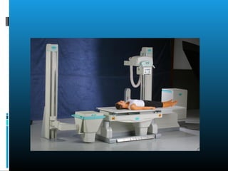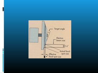 The document discusses the components and functioning of an x-ray tube. It describes the protective housing, cathode assembly made of thoriated tungsten, common anode materials like copper and molybdenum, and rotating versus stationary anodes. It also covers topics like the focal spot where electrons hit the anode, line-focus principle, heel effect, space charge effect, methods of heat transfer, voltage rectification, bremsstrahlung and characteristic radiation production, and how x-ray interaction varies with energy.