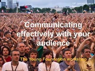 This document provides an agenda and materials for a workshop on effective communication. The workshop covers identifying the audience, assembling compelling stories, and targeting media coverage. It includes exercises to help attendees understand these concepts. Presenters Simon Francis and Emma Prince have extensive experience in public relations and communications campaigns. The workshop aims to teach attendees how to craft strong media materials like press releases and case studies, find relevant media contacts, and join online conversations to promote their messages.