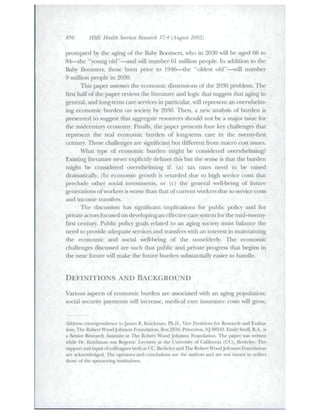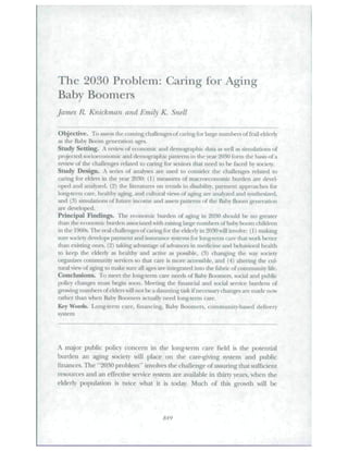 This document discusses the challenges of caring for aging Baby Boomers in the year 2030. It finds that while the economic burden may not be greater than that of raising Baby Boomers as children, there will be real challenges involving developing better long-term care payment systems, promoting healthy aging, improving access to community services, and integrating all ages into community life. To adequately meet long-term care needs, social and policy changes must begin soon to allow necessary changes to be made gradually rather than waiting until Baby Boomers need long-term care.