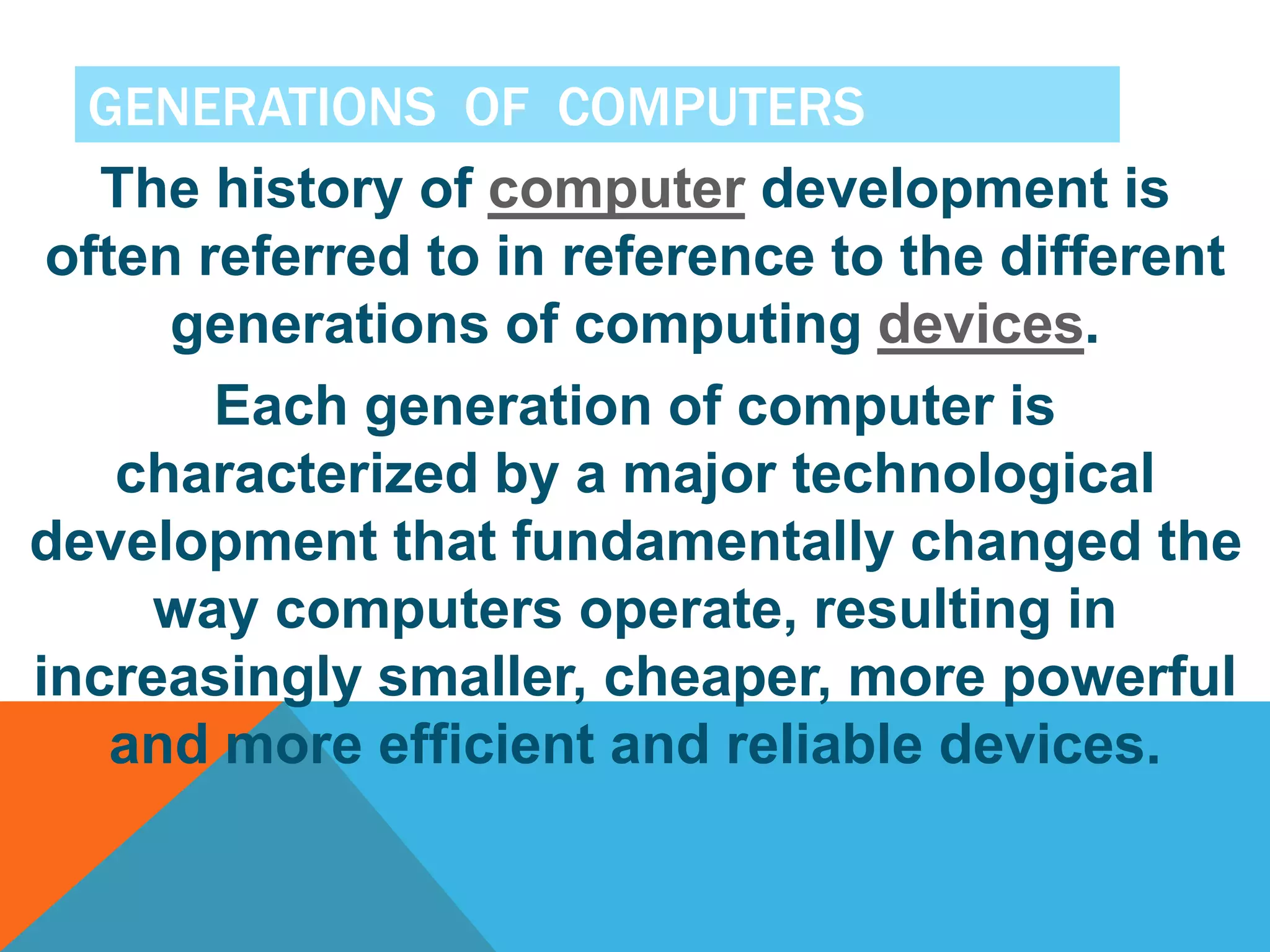 The document discusses the five generations of computers from the 1940s to present. The first generation used vacuum tubes, the second used transistors which made computers smaller and more efficient. The third generation used integrated circuits on silicon chips which further increased speed and efficiency. The fourth generation used microprocessors integrated onto a single chip which led to the development of personal computers. Current and future generations aim to develop artificial intelligence through techniques like parallel processing, quantum computing, and nanotechnology.