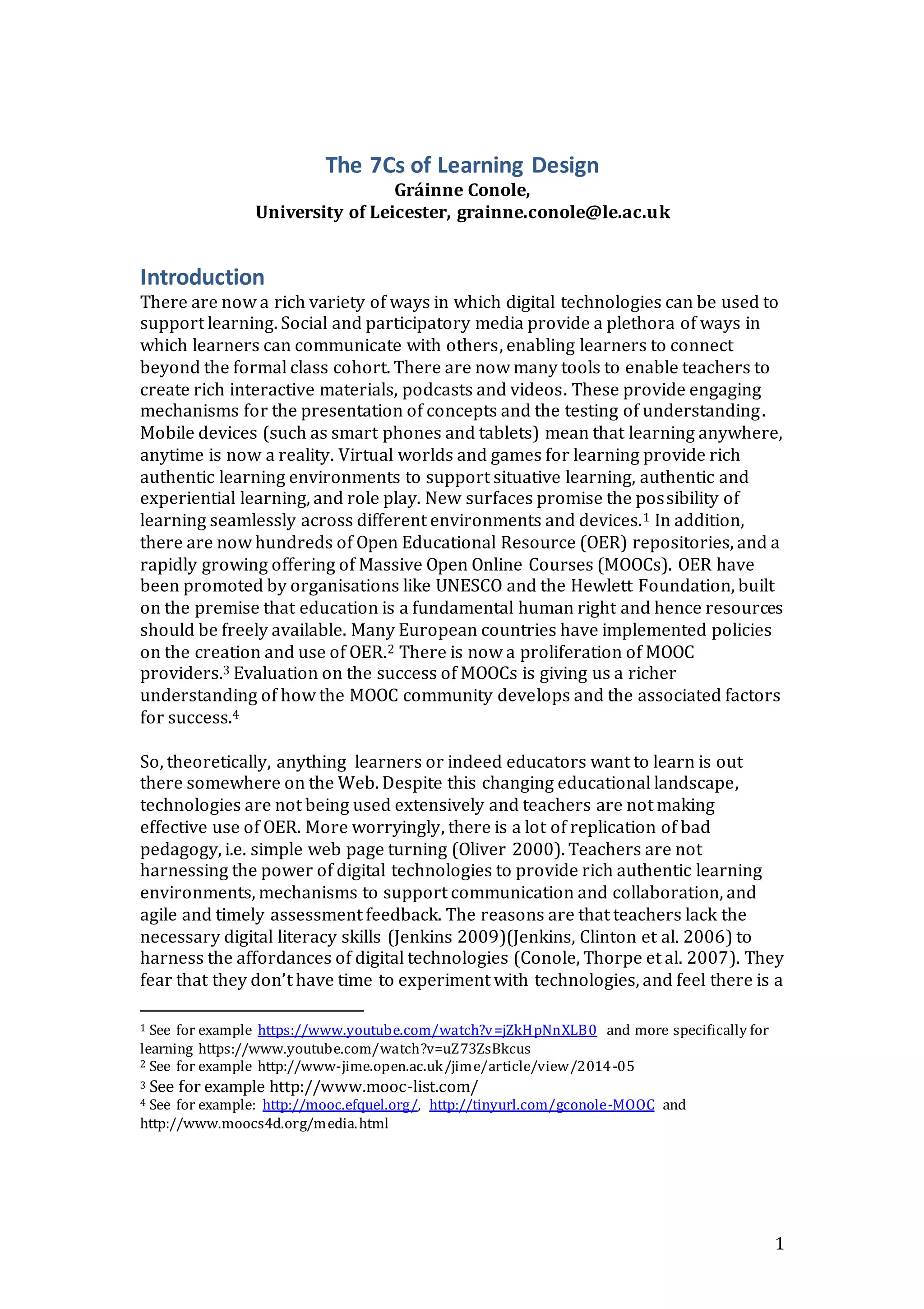 The document describes the 7Cs framework for learning design. The 7Cs include Conceptualize, Create, Communicate, Collaborate, Consider, Combine, and Consolidate. This framework aims to guide educators in designing learner-centered learning experiences that make effective use of digital technologies and activities beyond traditional lectures. It encourages educators to explicitly represent their designs so the designs can be shared, discussed, and improved.