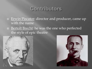 Epic theatre was designed to incite rational thought rather than create an illusion. It used techniques like the alienation effect to remind audiences they were watching a play. Epic plays by Bertolt Brecht followed familiar stories from different viewpoints to prevent sympathy for characters. Epic actors were narrators who demonstrated actions rather than emoting. The goal was to show experiences rather than feelings. Brecht's stage presented topics for discussion and did not hide theatrical elements to remind viewers it was fake. He wanted a relaxed audience interested in being entertained and thinking.