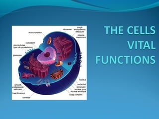 This document discusses key concepts about cells and cellular processes. It defines cells as the structural and functional units of living things. It describes three main cell structures - the cell membrane, cytoplasm, and nucleus. It explains two main types of cells - prokaryotic and eukaryotic - based on where their genetic material is located. The document also summarizes cellular functions like nutrition, respiration, and division.