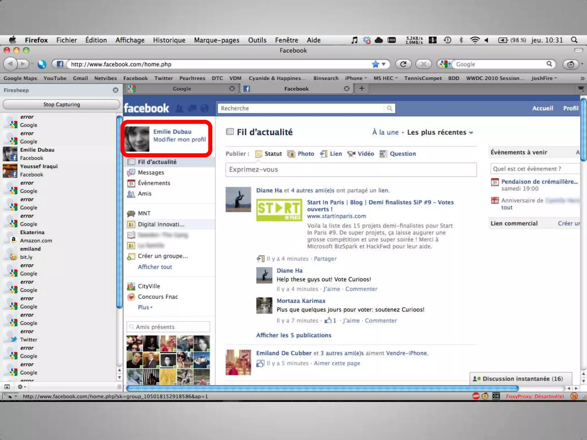 This document provides an overview of a local network infrastructure including connections to an ISP and the internet. It discusses wireless security protocols like WPA and WEP. It then demonstrates a tool called FireSheep that can be used to steal Facebook cookies over unencrypted WiFi connections. Finally, it recommends using a VPN or HTTPS to better protect information when connecting to public WiFi networks.