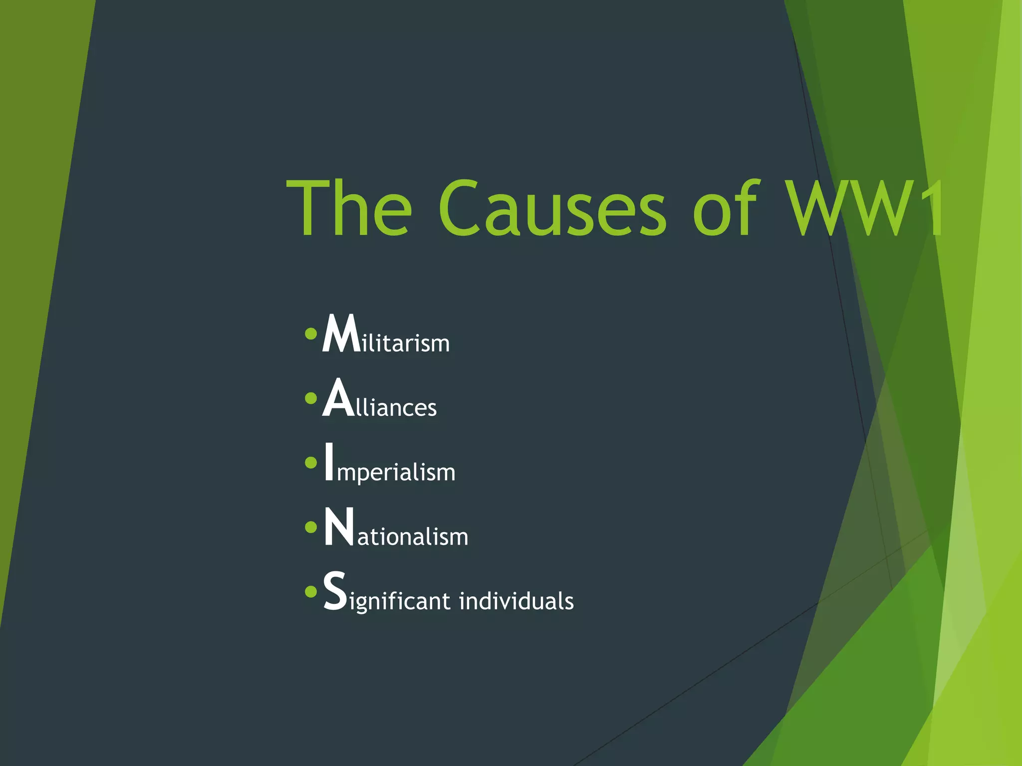 The document outlines several key causes of World War 1: militarism led European powers like Germany and Russia to rapidly expand their armed forces, the system of alliances meant local conflicts could escalate into an international war, imperialism and nationalism increased tensions, and aggressive leaders like Kaiser Wilhelm II helped push countries towards conflict. The assassination of Archduke Franz Ferdinand provided the spark that ignited the powder keg of military buildups, nationalist tensions, and overlapping alliances that led Europe into the first modern world war.