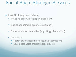 This document outlines SEO services including link building strategies, digital audits, keyword analysis, analytics and monitoring, customer targeting, and keyword implementation plans. Link building can involve press releases, social bookmarking, submission to share sites, and local directories. Digital audits analyze content, tools, competitors, keywords, and provide reports. Customer targeting identifies current and desired customer beliefs and behaviors. Keyword implementation plans specify where keywords will be used.