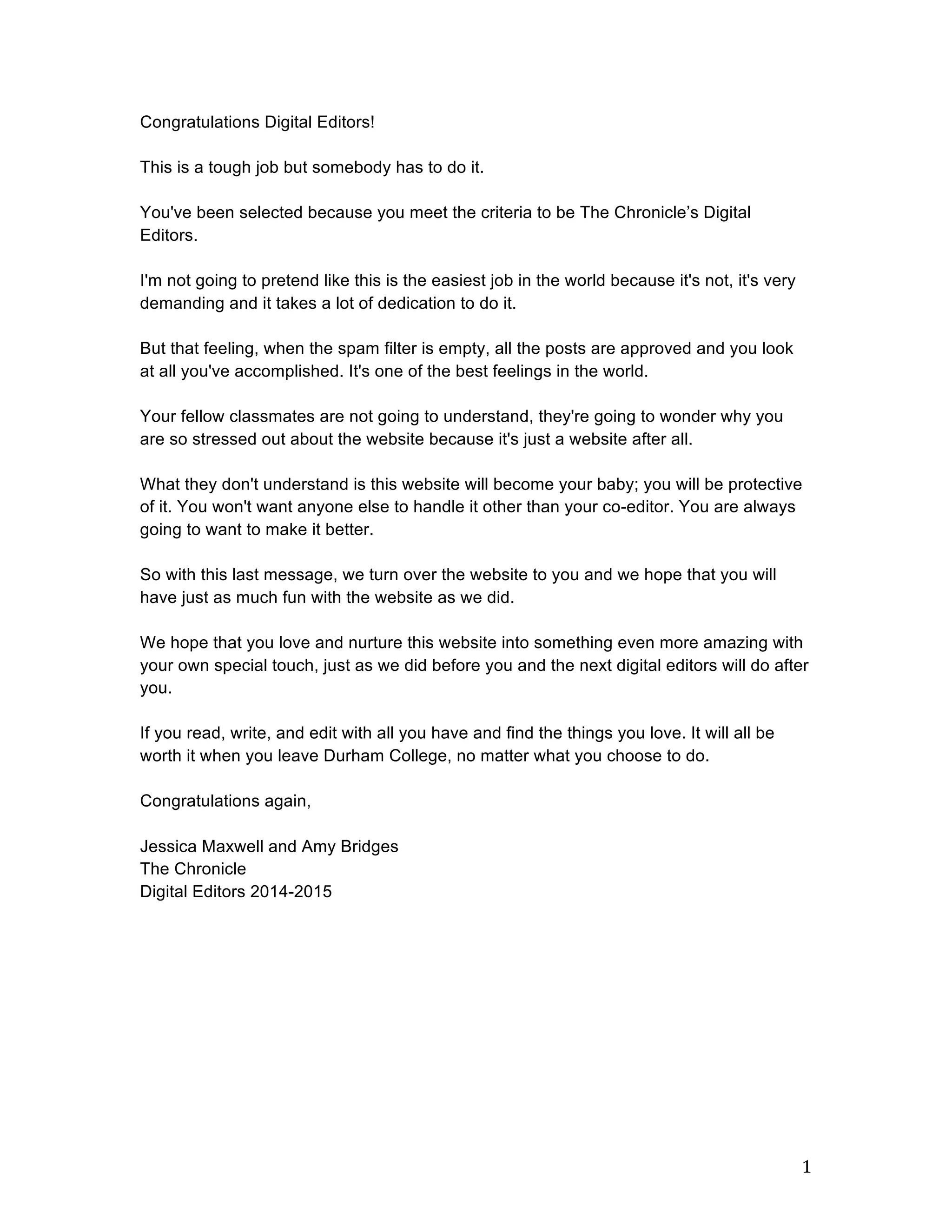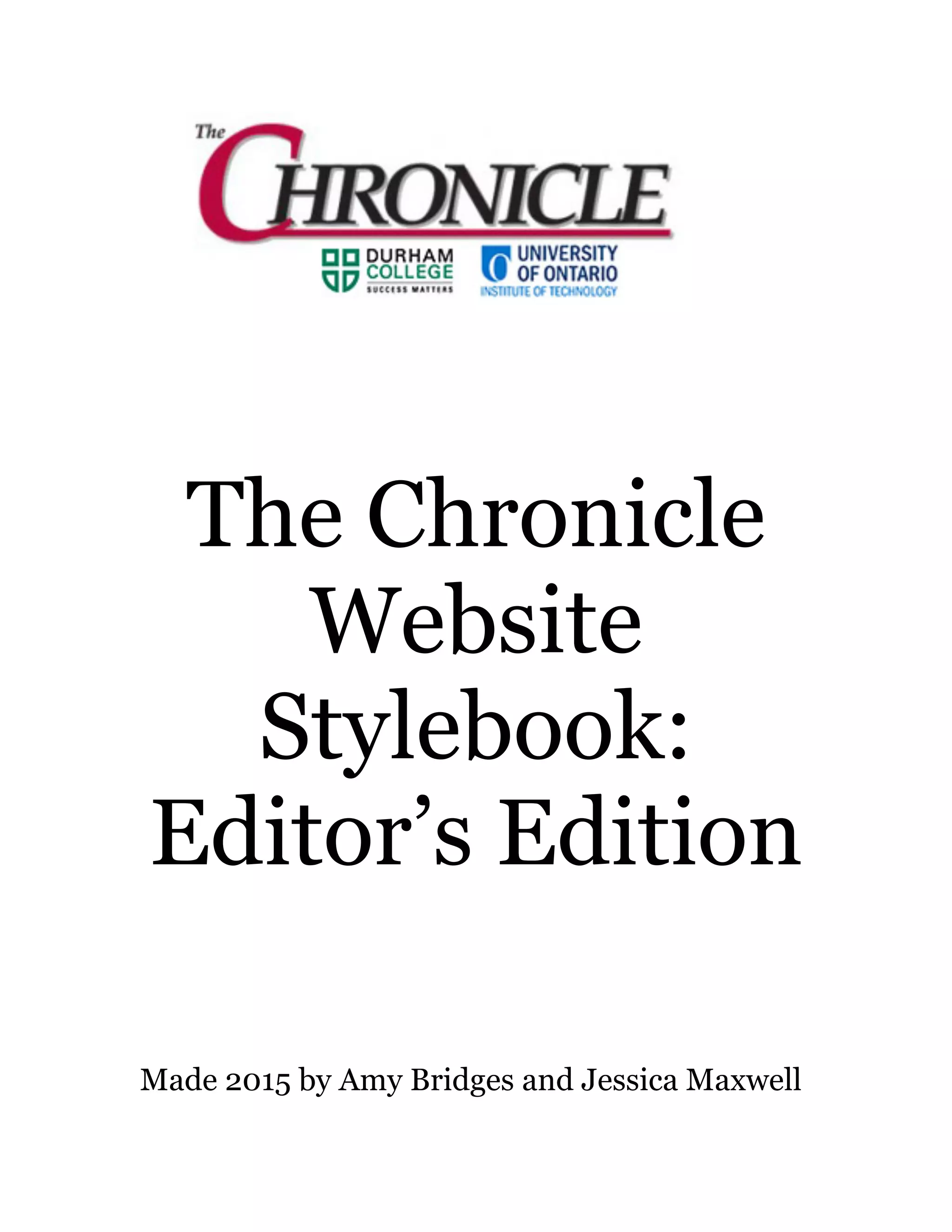 The document provides guidance for new digital editors of The Chronicle website. It discusses how to add new users and authors, upload photos through Gravatar, and troubleshoot start-up issues. It also provides instructions for posting articles, uploading photos and videos, approving comments, using widgets, changing the website layout, and links to other helpful resources. The document is a training manual and guide for digital editors to effectively manage and update the website.