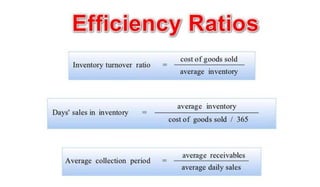 Financial analysis involves assessing business entities, projects, budgets, and forecasts from a financial perspective by analyzing financial statements. It helps with decision making related to investing and financing. External analysis is conducted by outsiders to determine liquidity and ability to generate funds, while internal analysis is done by management to ensure business functions align with goals. The objectives of financial analysis are to determine profitability, financial position, operational efficiency, and future risks and opportunities. Common types of analysis include vertical analysis, horizontal analysis, growth rates analysis, profitability analysis, and liquidity analysis. Financial analysis provides useful insights but has limitations as it relies on historical data and does not consider intangible assets.