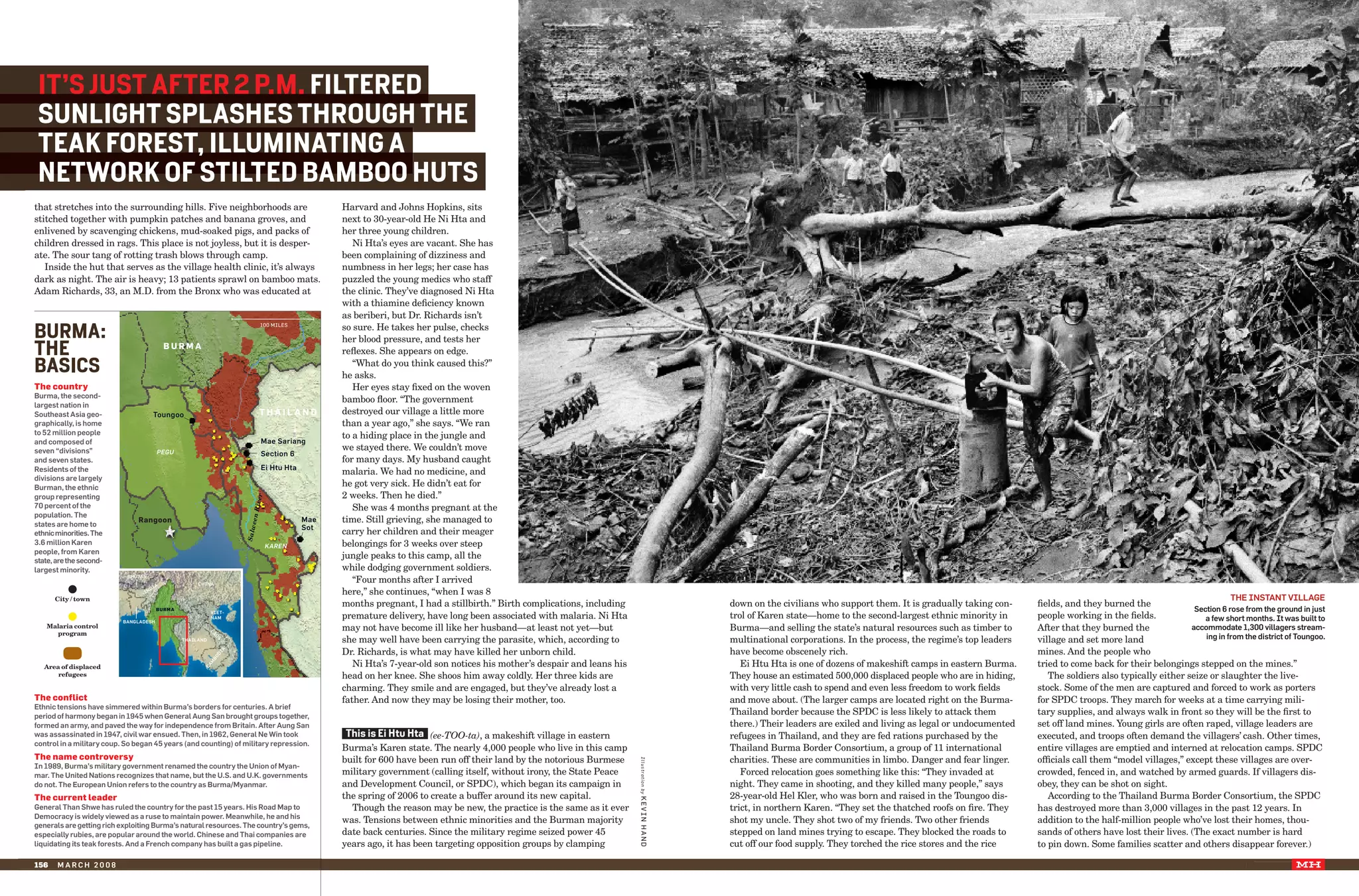 1) Dr. Adam Richards works in a makeshift clinic in a refugee camp in eastern Burma to treat the nearly 4,000 displaced people who live there. 2) The refugees have been forced from their land by the Burmese military government and many suffer from malaria and other illnesses due to lack of access to healthcare. 3) Dr. Richards and local medics work to diagnose and treat malaria and other diseases in difficult conditions, trekking through the jungle to reach remote villages to save lives.