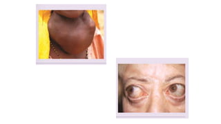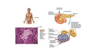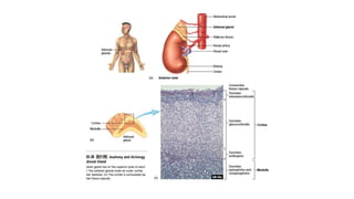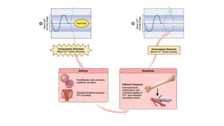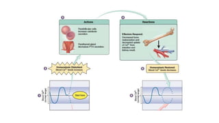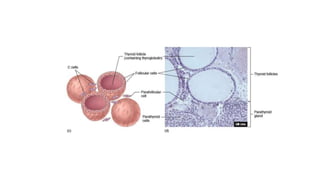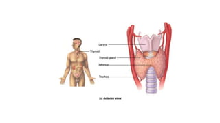 The document summarizes key aspects of the endocrine system. It describes how the endocrine system is composed of glands that secrete hormones directly into the bloodstream to regulate distant target tissues. It provides details about major endocrine glands like the pituitary gland, thyroid gland, parathyroid glands, adrenal glands, and how they regulate important body functions through negative feedback loops and secretion of hormones like thyroid hormones, growth hormone, cortisol, and others. It also explains the different types of stimuli that regulate hormone release and the chemical nature of hormones.