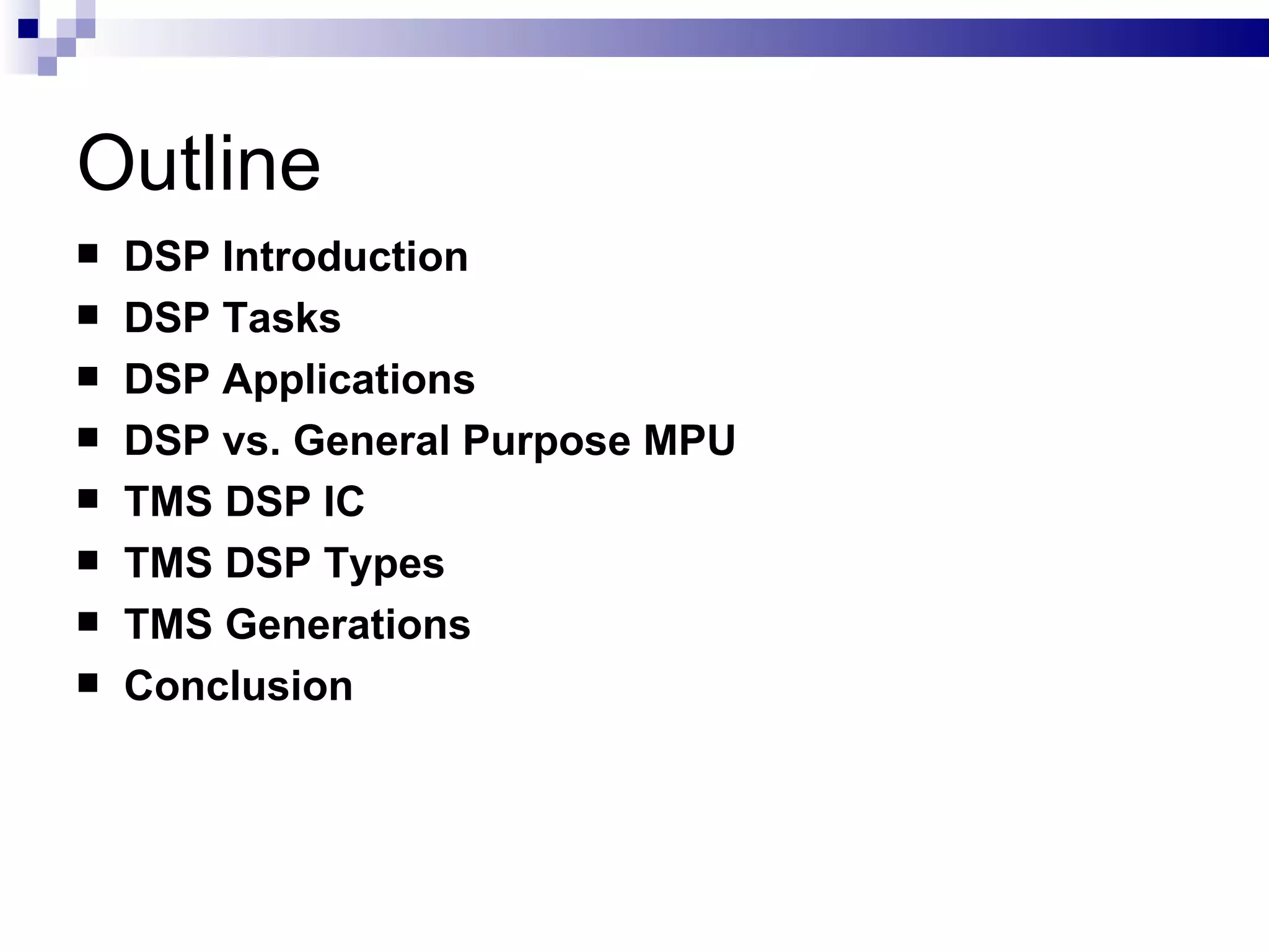 The document discusses the evolution of Texas Instruments' TMS digital signal processors (DSPs) from the 1st to the 6th generation, outlining their architecture, capabilities, and applications in real-time processing. It highlights the advancements in performance, with increasing clock frequencies and computational power tailored for various tasks such as telecommunications, video processing, and audio applications. The conclusion emphasizes the growing complexity of applications and the necessity for DSPs to accommodate these demands efficiently.