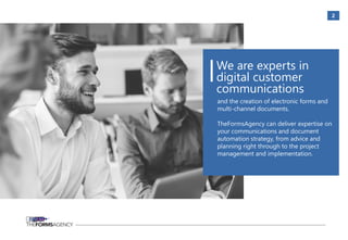 TheFormsAgency specializes in document automation and digital customer communications, offering tailored solutions for diverse industries such as banking, insurance, and government. They provide expertise in creating smart forms and optimizing communication strategies to enhance customer engagement while reducing costs and complexity. With a proven track record of successful implementations and partnerships, TheFormsAgency aims to revolutionize how businesses handle their document processes.