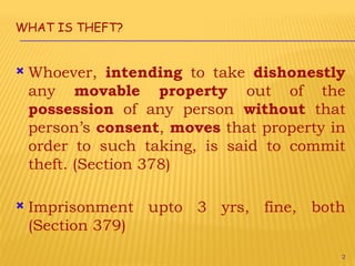 The document discusses various criminal offenses related to theft, extortion, robbery, and dacoity as defined by law. It outlines the legal definitions, implications of mens rea, and compares the elements of theft and extortion, emphasizing the role of intention and consent. Additionally, it addresses the specific conditions under which robbery and dacoity occur, particularly in relation to group involvement and the requirement for fear and violence.