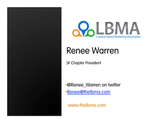 The document provides information about the Location Based Marketing Association (LBMA) annual conference. It lists the founder and president of LBMA, Asif Khan, and the San Francisco chapter president, Renee Warren. It then thanks sponsors and discusses how location changes consumer behavior. It notes that 5 billion people use mobile worldwide and that check-ins are just part of a larger location-based ecosystem. The LBMA aims to unite media, platforms and brands around location-based engagement. Several case studies are presented on how companies have used location-based services and marketing successfully. The document concludes by discussing the future of location analytics and measurement and how a future without location is not possible.