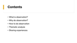 The document discusses the process of thematic analysis in research, emphasizing the importance of observation as a methodological tool for understanding social behaviors. It outlines the steps involved in thematic analysis, including familiarization with data, coding, generating themes, and writing up findings. Additionally, it highlights different types of observation methods and their implications for enhancing the validity of research findings.