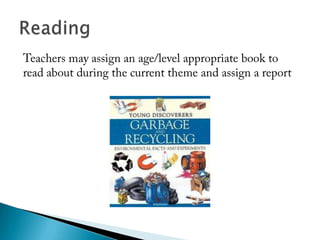 This document contains a lesson plan for a third grade recycling unit. The unit will be taught over several weeks and focuses on identifying recyclable items, reusing or recycling items from home, and having students write and present about their recycling project. Materials needed for the introductory lesson include various household items that can be recycled as well as a letter to parents. The goals are for students to name and describe recyclable items, reuse/recycle at home, and write and present about their project.