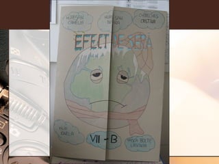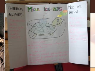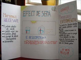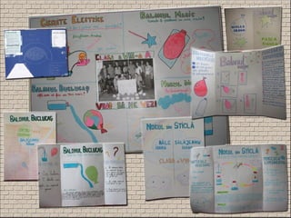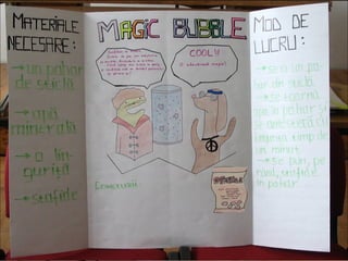 The document discusses thematic posters and arrangements for presenting physics projects at the George Cosbuc School in Baia Mare, Romania. It lists the titles of student projects such as "Magic Balloon," "Cloud in Glass," "Troublesome Balloon," "Potato Floating," "Cola Secret," "Magic Lemon," "Rocket Balloon," "Water Rocket," "Animation," and "Magic Colors." It also thanks the physics teacher Ana Elena Puscas.