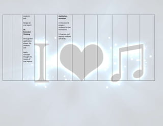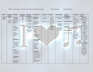 This document provides a thematic unit plan on listening and speaking through music. The theme is appreciation for music. Key objectives are for students to explore concepts of music, define related vocabulary, and express themselves through music. Activities include exploration of music topics, answering questions, playing music for expression, and designing an oral report on a favorite music element. Assessment includes group discussions, oral reports, and total unit time is estimated at 5 to 7 days.