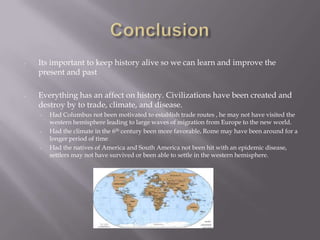 1. The document discusses how historical events are interconnected and can have unintended consequences. For example, Columbus' voyage that established trade routes between Europe and the Americas unexpectedly led to large migrations that introduced diseases devastating native populations.