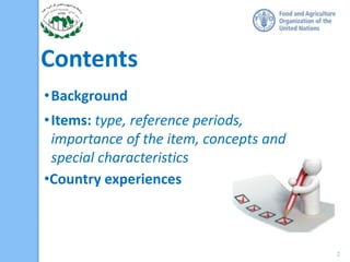 The workshop on the World Programme for the Census of Agriculture 2020 discussed key themes and items for the census, focusing on identification, general characteristics, and the experiences of various countries. It outlined 15 themes with 128 items, introducing new elements such as the presence of hired managers and income proportions, while emphasizing the importance of accurately collecting data about agricultural holdings. The document presents specific items related to holders' legal status, age, and economic activities that are crucial for developing agricultural policies and understanding rural economics.