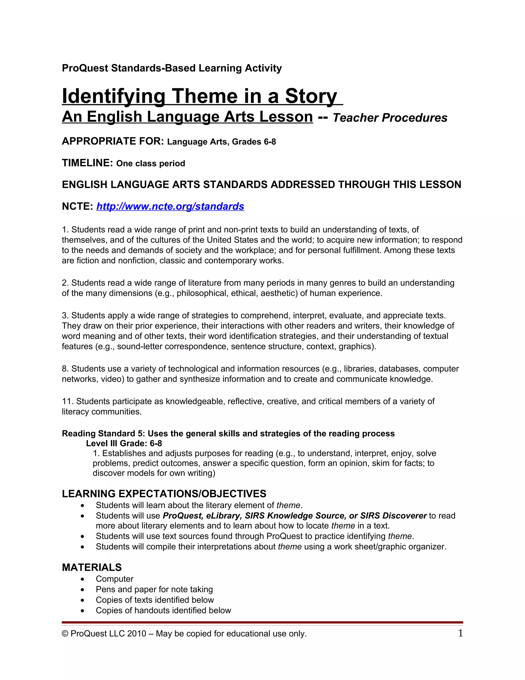 This document provides a lesson plan for teaching 6th-8th grade students about identifying themes in stories. The lesson involves students researching the concept of literary themes using online databases. They then analyze themes in Aesop's fables and the story "The Turnip." Students practice identifying themes by reading "The Turnip" and filling out a graphic organizer to determine the story's theme. They then discuss their interpretations in pairs and as a class.